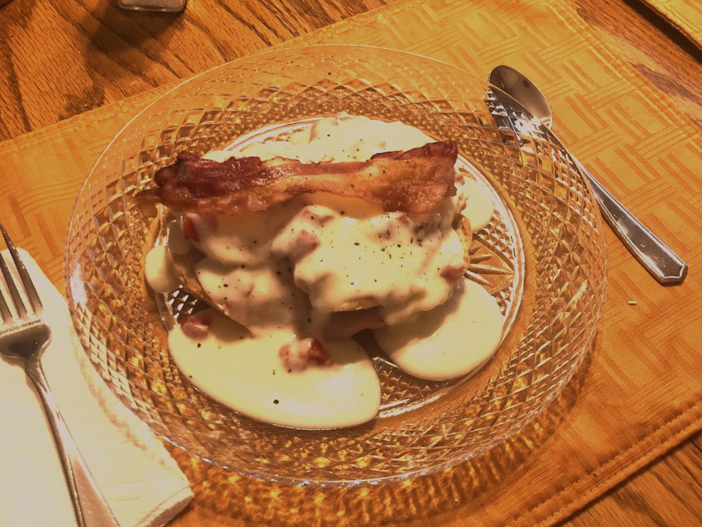 I made a cheese sauce of butter, 2% milk, flour, and shredded Parmesan cheese from a recipe in the Better Homes and Garden Cookbook. Then poured it over the whole thing. Finally, adding a slice of bacon. It was very good.